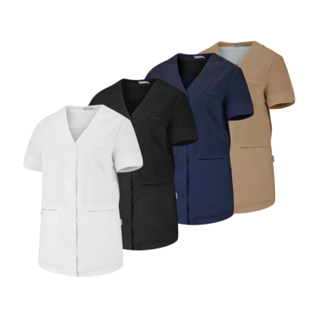 Conçue en matière recyclée douce et respirante, elle associe style, confort et fonctionnalité, idéale pour les métiers du soin, de l’esthétique ou du bien-être.